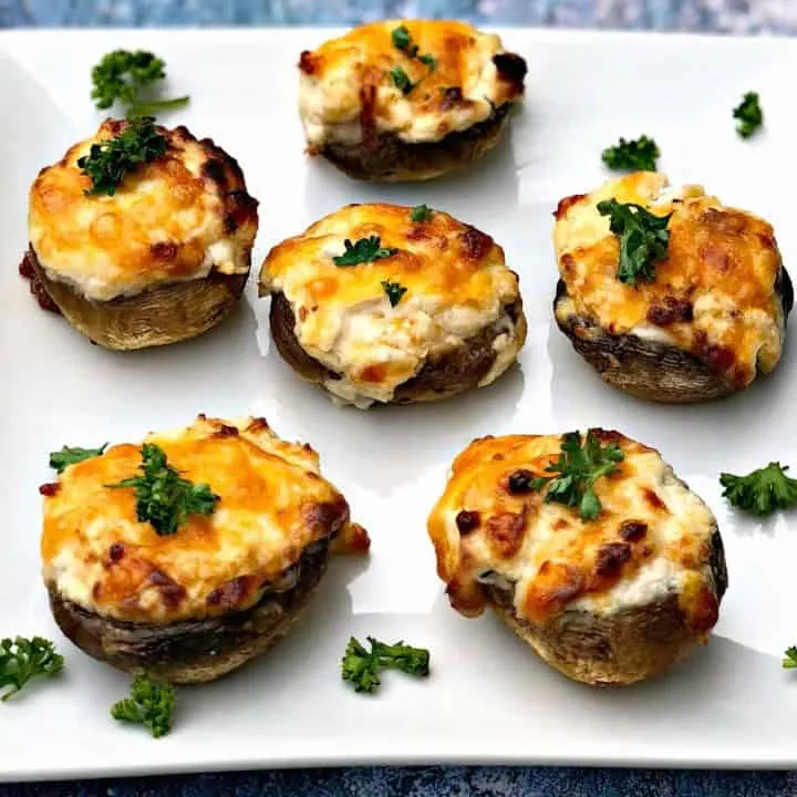 Fifteen Minute Air Fryer Three Cheese Stuffed Mushrooms is a low-carb, keto-diet friendly recipe that is quick and easy to make. This recipe is loaded with parmesan, sharp cheddar, and white cheddar cheese, creamy cream cheese, and savory garlic. This dish is the perfect appetizer for parties, events, and gatherings.