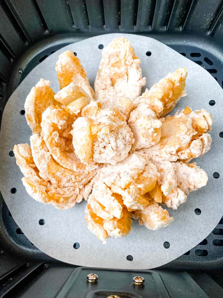 Cook the onion for 10 minutes and then spray it again with oil. Be sure to get any of the spots with flour. Air fry again for an additional 10-15 minutes or until the onion is completely crisp.
