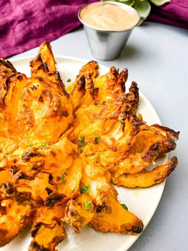 Air Fryer Blooming Onion Recipe or a Sweet Vidalia Onion Blossom is a quick and easy recipe using a whole onion to create the best crunchy, crispy breaded appetizer. Dip the onion petals in a zesty dipping sauce.