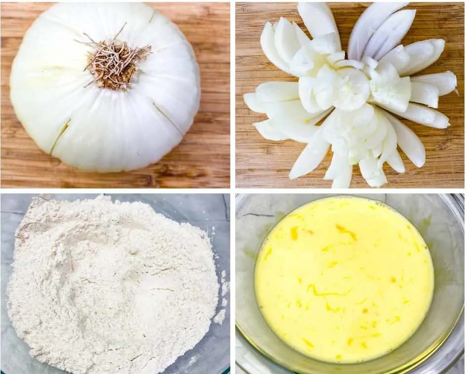 You can let the onion soak in ice water for 15 minutes up to an entire night before coating and cooking if you want. Cut it correctly and then drop it in the cold water. Remove and let it drain well. You may want to pat it with paper towels. This helps the flour mixture to adhere better. I've always soaked mine beforehand. I form a loose bowl of aluminum foil to set in the air fryer also.