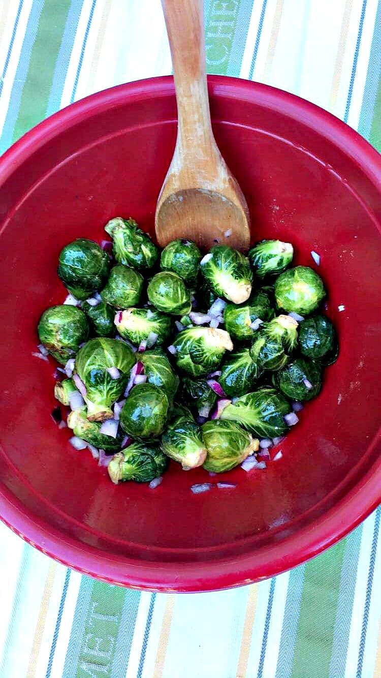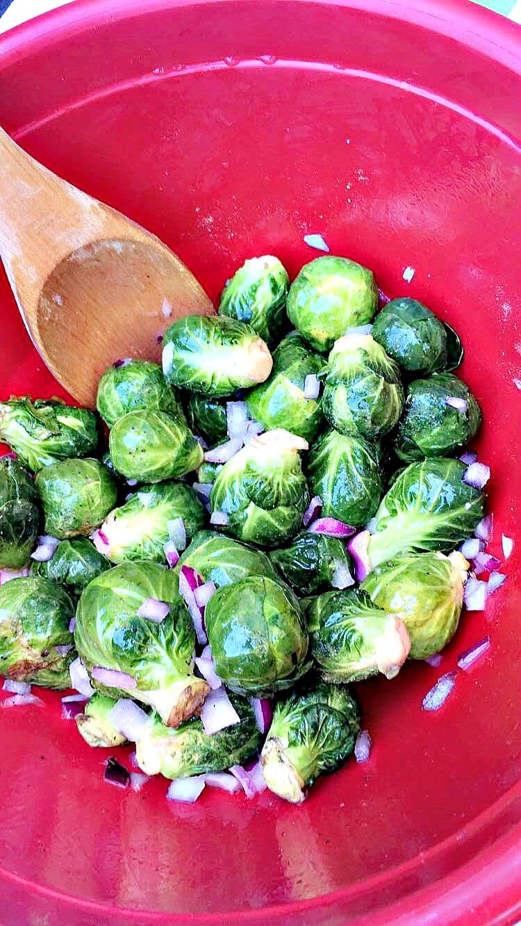 - In a large bowl, toss the Brussels sprouts, olive oil, red onion, salt, pepper, and mustard seasoning.