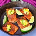 This Easy Blackened Salmon Recipe is the best seasoning for salmon loaded with spices and herbs like smoked paprika, cayenne pepper, garlic powder, thyme, and onion powder. This simple meal is ready in 15 minutes making it perfect for weeknight dinners. You can even toss the fish in tacos or on salads!