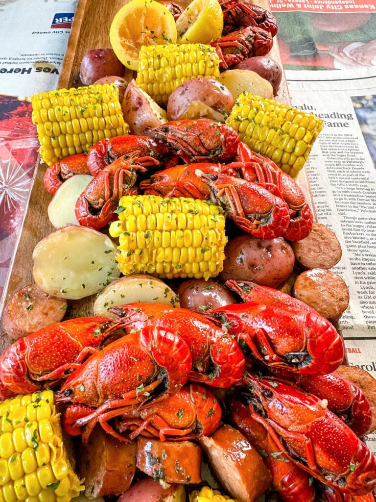 - Use a strainer to remove the crawfish, corn, potatoes, and sausage from the pot and drain the excess water.
