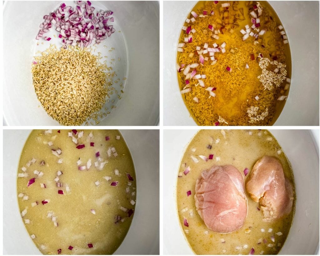 - Add the rice, chicken broth, cream of chicken, and chopped onions to the slow cooker.