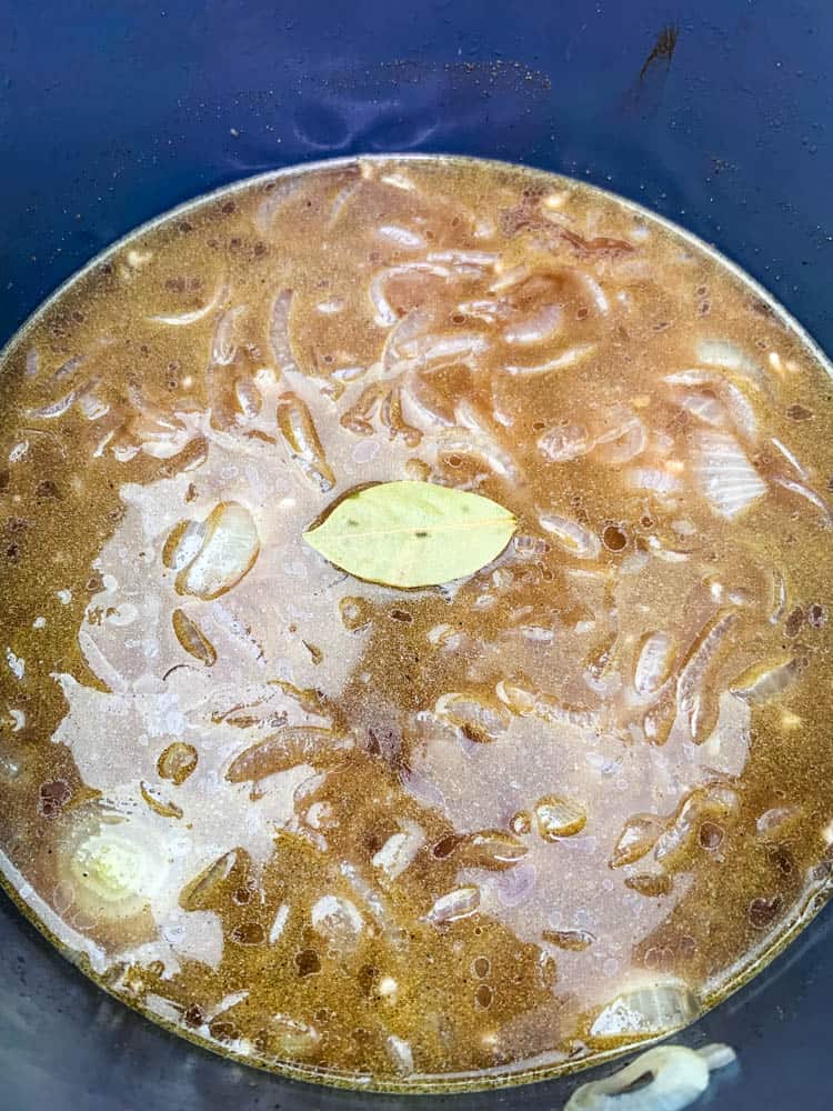 The recipe requires beef broth (you can even use beef bone broth if you wish), red wine, garlic, olive oil, yellow onions, a bay leaf, butter, brown sweetener, and a few spices.
