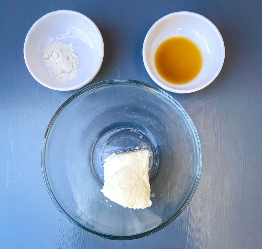 For the icing you will need softened cream cheese, vanilla extract, and powdered sweetener.