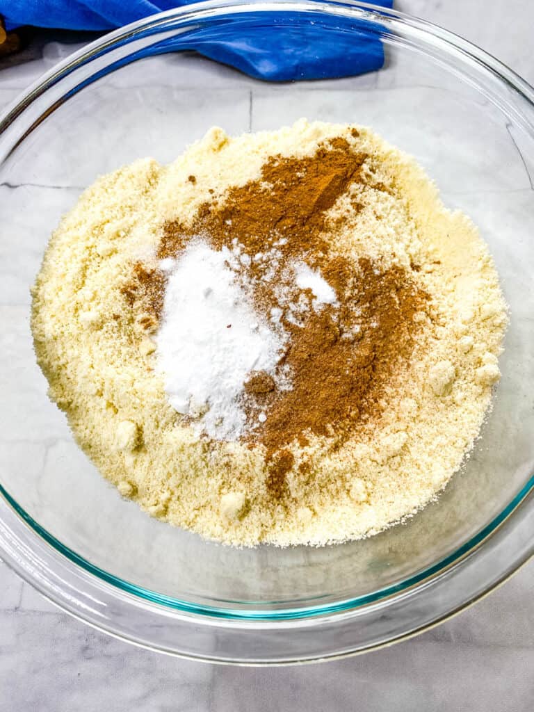 - Add the almond flour, cinnamon, pumpkin pie spice, baking soda, baking powder, and salt to a separate bowl. Stir to combine.