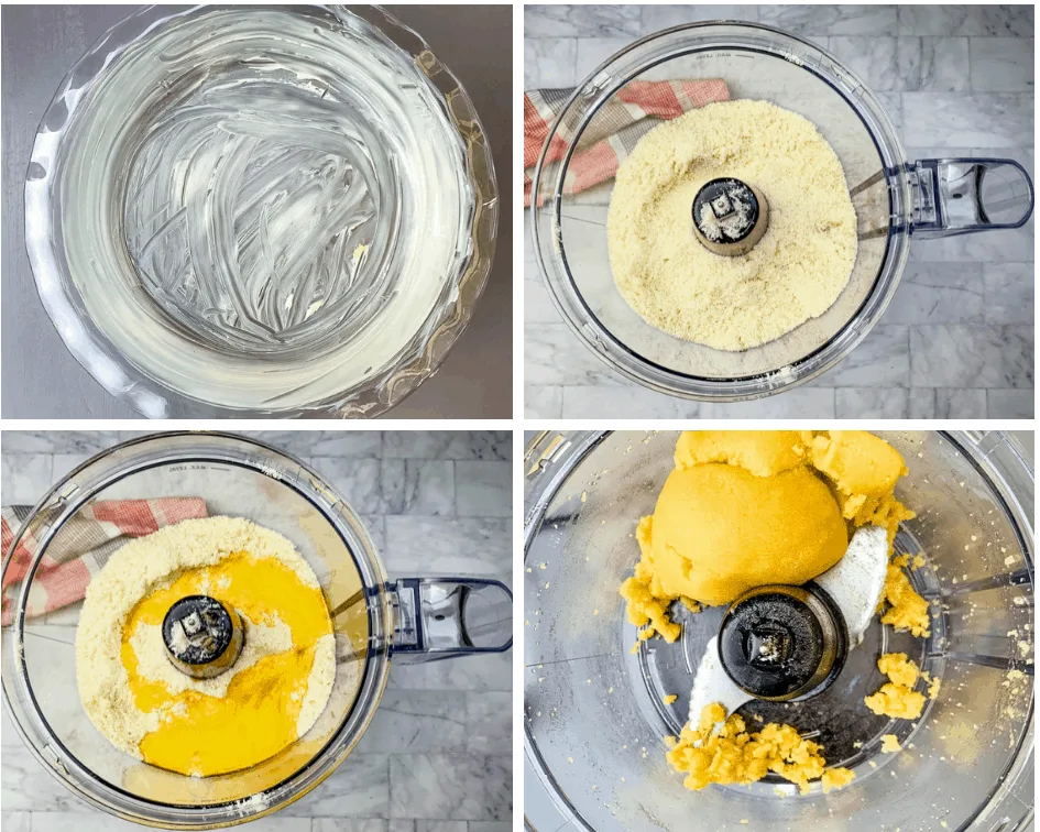 - Make the crust if you aren't using store-bought. Add almond flour, melted butter, sweetener, salt, and an egg to a food processor and pulse until incorporated.