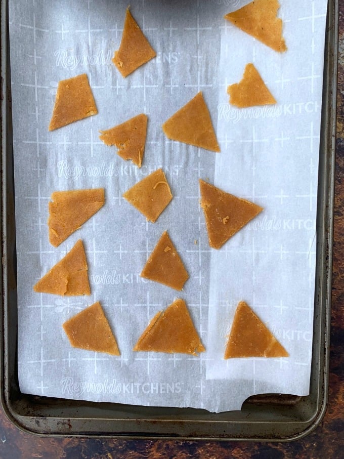 - Cut the dough into triangles using a pizza wheel. I first made horizontal slices across the dough. Then I made diagonal slices across the dough. Watch the video above for visual illustration. It will be difficult to slice each chip into the exact same size.