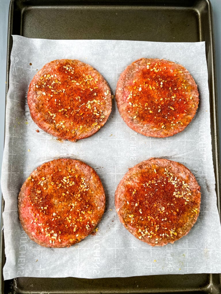 Take this into account if using pre-made patties. When you defrost the burgers they are more likely to fall apart when they come to room temperature. Once defrosted, I separate the burgers onto parchment paper and keep them in the fridge until I'm ready to season and grill.
