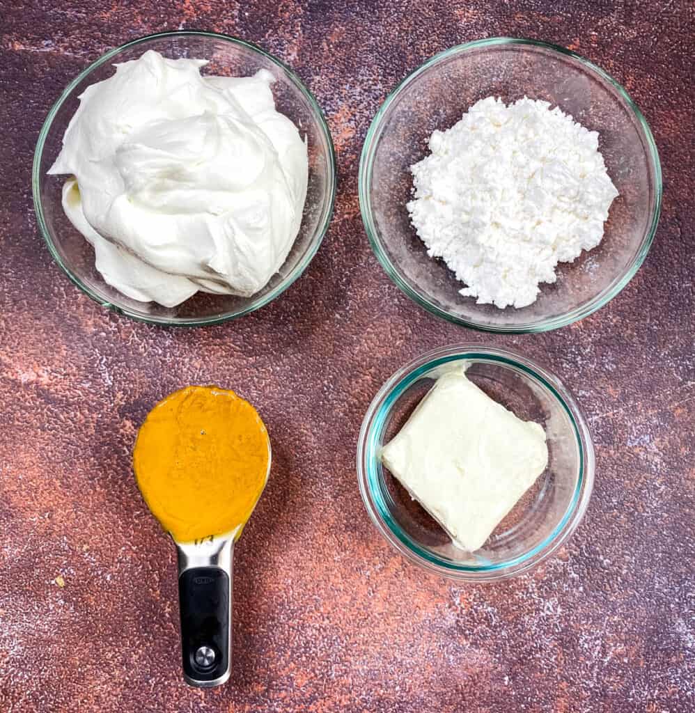 - Combine 4 ounces of cream cheese and ⅓ cup powdered sweetener separately. Beat for 1 minute until combined.