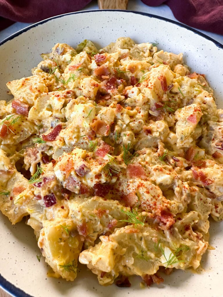 Since this is a spin off of the classic version and has added bacon, I love to use my Homemade Ranch Seasoning. Classic potato salad usually has mustard, relish, and paprika for flavor. I keep those in. If you want something more in line with a BLT, maybe omit the mustard.