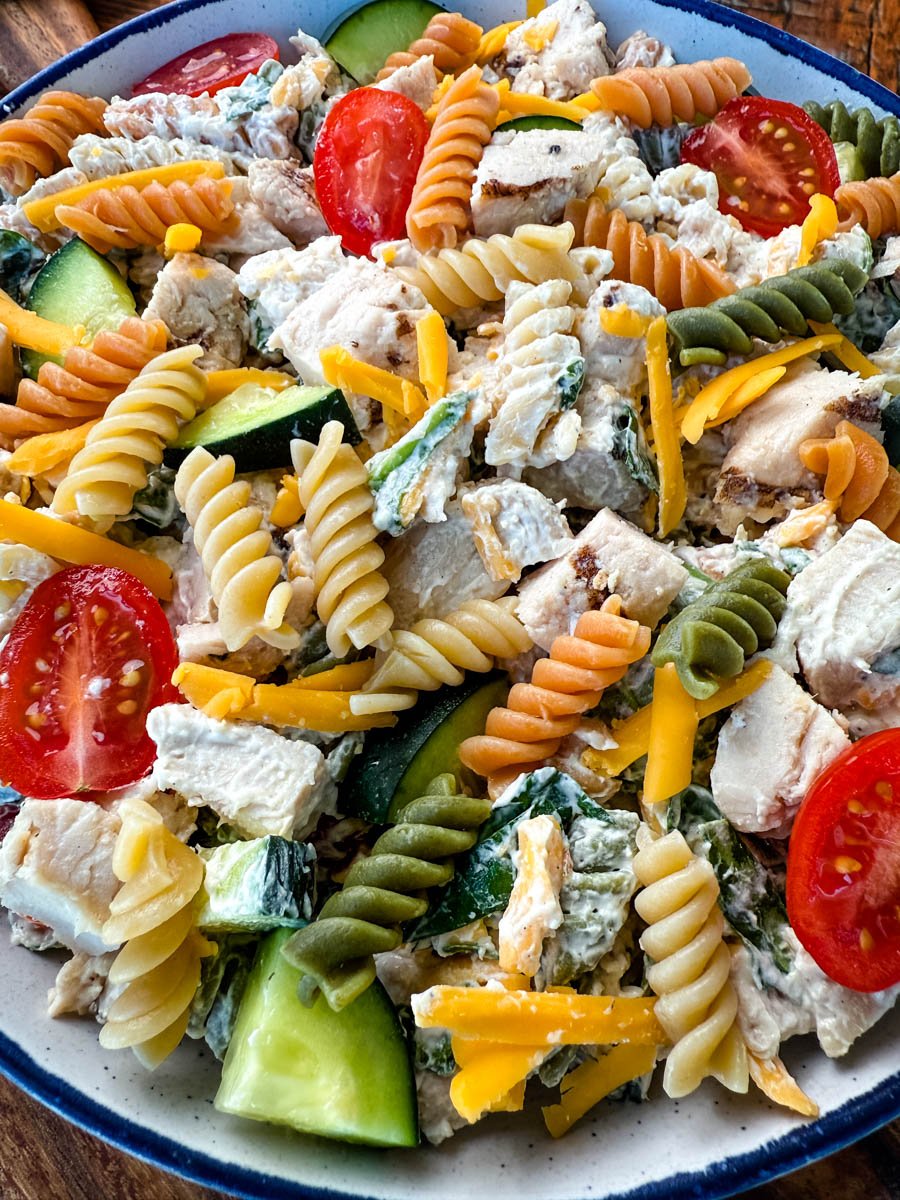 Pasta salads with creamy or dairy-based dressings do not freeze well. The texture becomes grainy, and the pasta can turn mushy when thawed. If freezing is necessary, freeze only the cooked chicken separately, then assemble the fresh pasta salad when ready to eat.