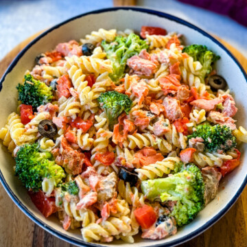 This refreshing Salmon Pasta Salad is perfect for a light lunch or dinner. This dish combines tender, flaky salmon with a creamy homemade dressing, pasta, and fresh vegetables for a great mix of flavors and textures. This dish is quick to prepare and easy to customize as an excellent choice for meal prep, picnics, or any time you want a nutritious meal.
