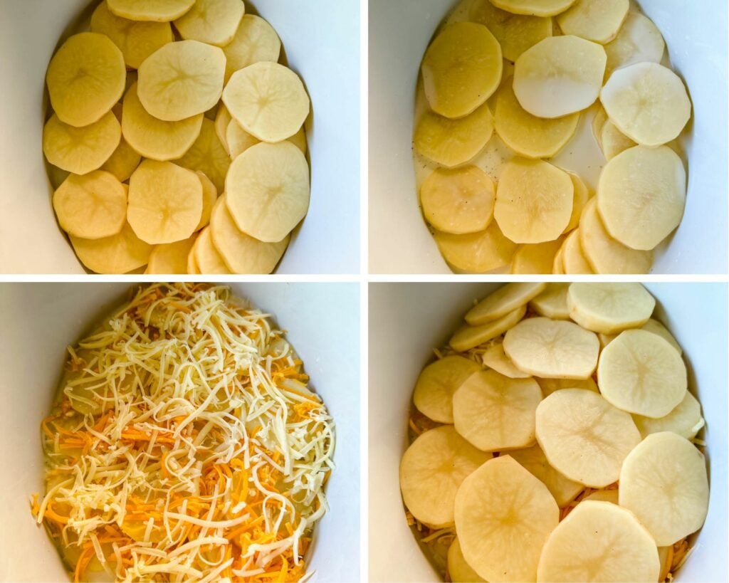 - Add ⅓rd of the sliced potatoes to the bottom of the slow cooker.