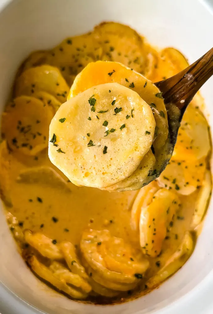 - Place the lid on the pot and cook the potatoes for 3-4 hours on High or 4-6 hours on Low. Every slow cooker cooks at varying speeds, even when they are the same brand. If it’s your first time making the dish be sure to keep a watchful eye.I don’t like to use the “Keep Warm” setting when making Crockpot potatoes. If you keep heat on the potatoes, when cooked they will soften up even more and will likely fall apart. Keep this is mind while cooking.Once the potatoes are fully cooked and soft, allow the dish to cool and stand for 20-30 minutes before serving. This will thicken up the cheesy cream sauce. Don’t skip this step. The sauce may look thin and runny at first, but it will thicken up upon standing.