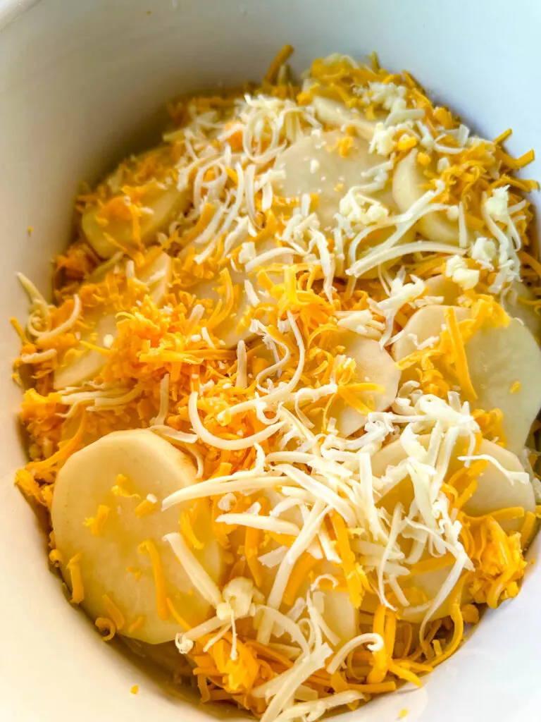 - Potatoes: You’ll want to use potatoes that can hold their shape and don’t turn into mush while they slow cook. Russet potatoes are the classic pick, high in starch, tender on the inside, and perfect for soaking up all that cheesy goodness. Yukon Golds bring that rich, buttery flavor and stay creamy without falling apart, giving your dish that velvety texture everybody loves. And red potatoes have smooth skin, a slightly sweet flavor, and hold up beautifully while baking. You really can’t go wrong with any of these, just pick your favorite vibe and roll with it.