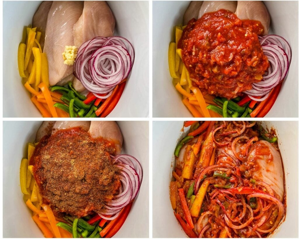 - Add chicken breasts, salsa, peppers, garlic, onions, and fajita seasoning to the slow cooker.