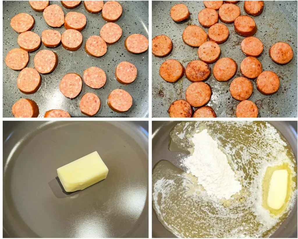 - Add the sliced sausage to a skillet on medium-high heat. Cook for 3-4 minutes on both sides. Remove the sausage from the pan and set aside.