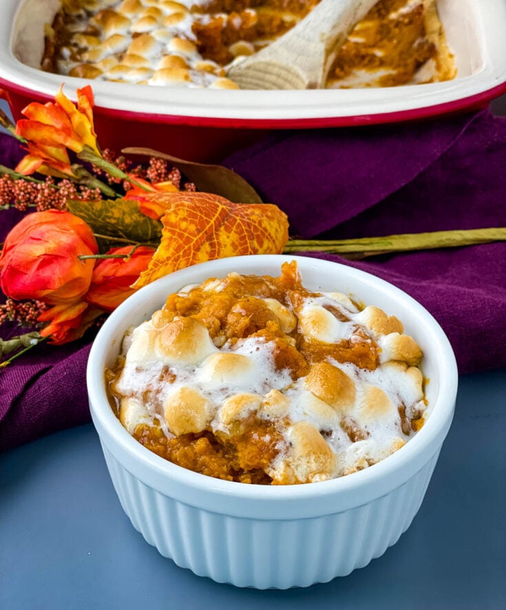 This Traditional Southern Sweet Potato Casserole with Marshmallows is baked to perfection with a pillowy soft and gooey topping. This makes the perfect dessert or side dish for Sunday dinners, Thanksgiving, or any holiday. Feel free to toss in pecans or any nuts you wish.
