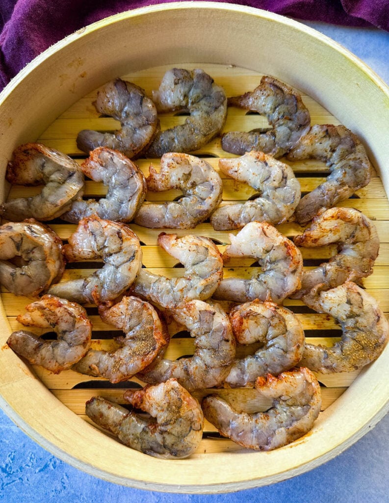 - Arrange the seasoned shrimp in the steamer basket or colander.