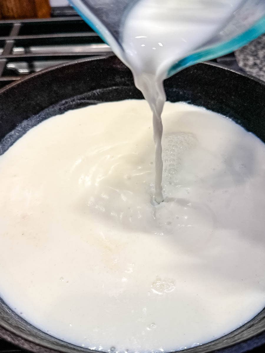 - In a large pot, pan, or saucepan, combine water and milk over medium heat. Once it starts to bubble gently (not a full boil), reduce the heat to low.