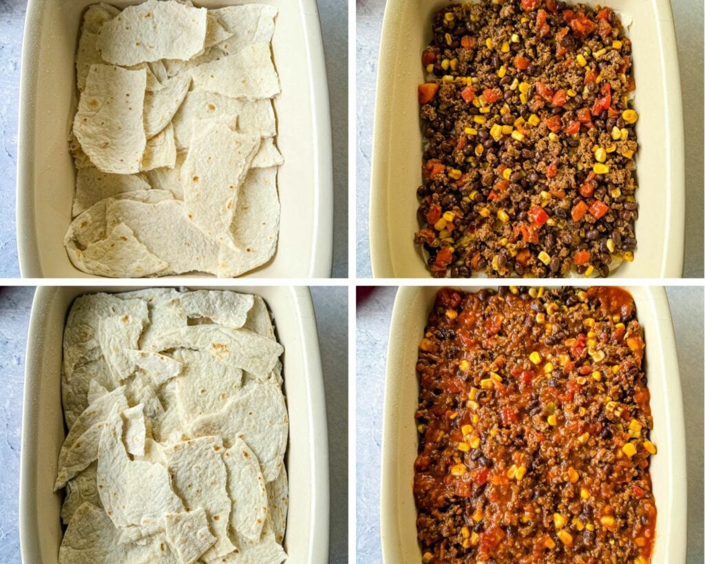 - Layering is key. Adding multiple layers of tortillas will create a barrier that can help prevent the dish becoming too soggy by absorbing excess moisture.