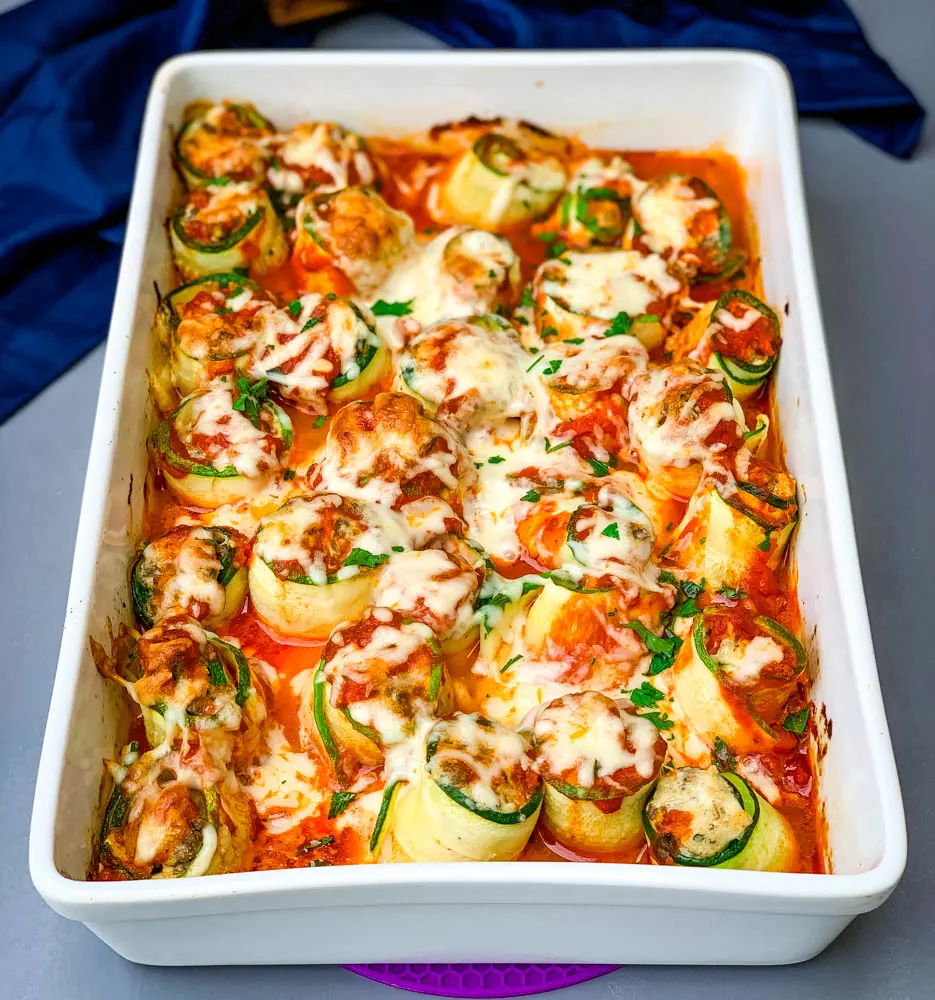 Easy, Zucchini Lasagna Roll Ups is the best recipe for veggie rolls stuffed with ricotta, cream cheese, and meat. This dish is low carb and keto-friendly and smothered in marinara and gooey melted cheese. You can serve this cheesy meal with zucchini noodles if you prefer.