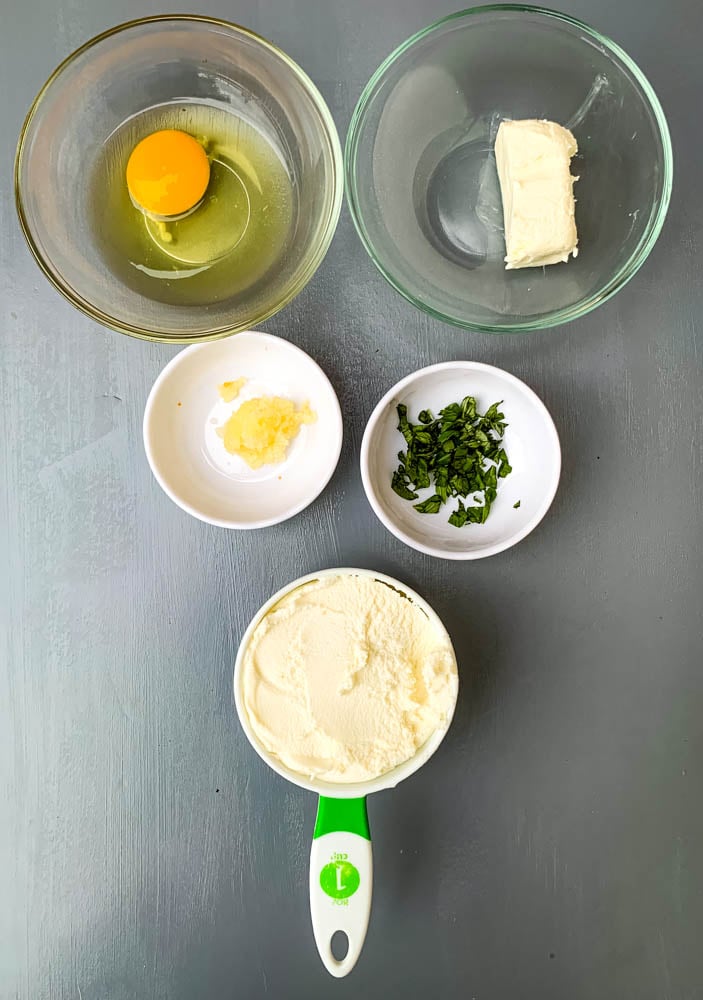 egg, cream cheese, ricotta, garlic, and basil in separate bowls for zucchini lasagna roll ups